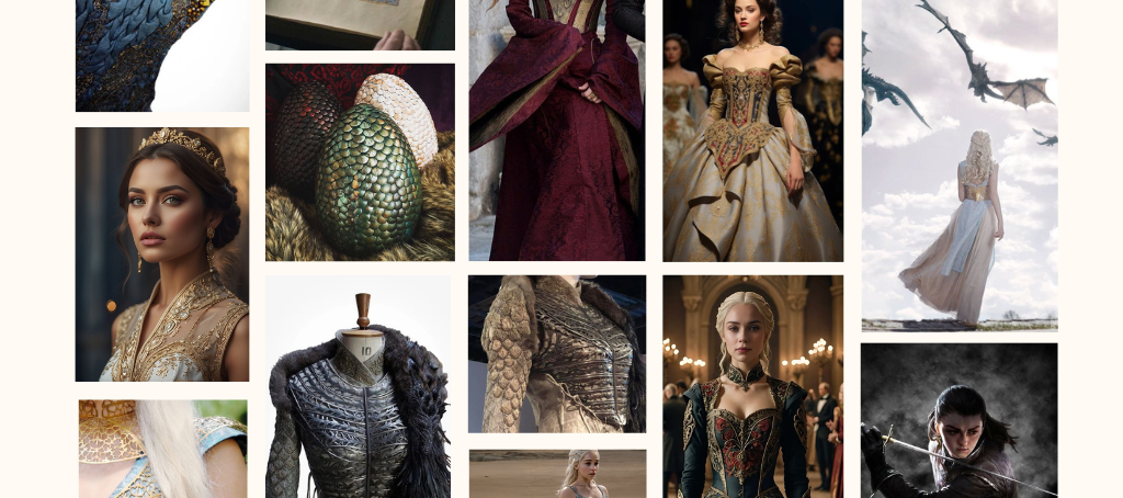 Crafted from luxurious materials such as velvet, silk, and brocade, the collection offers sumptuous evening wear perfect for gala and red carpet events. The rich color palette features deep jewel tones—emerald, sapphire, and ruby—complemented by shimmering metallics in gold and silver, encapsulating stately elegance and a regal vibe.